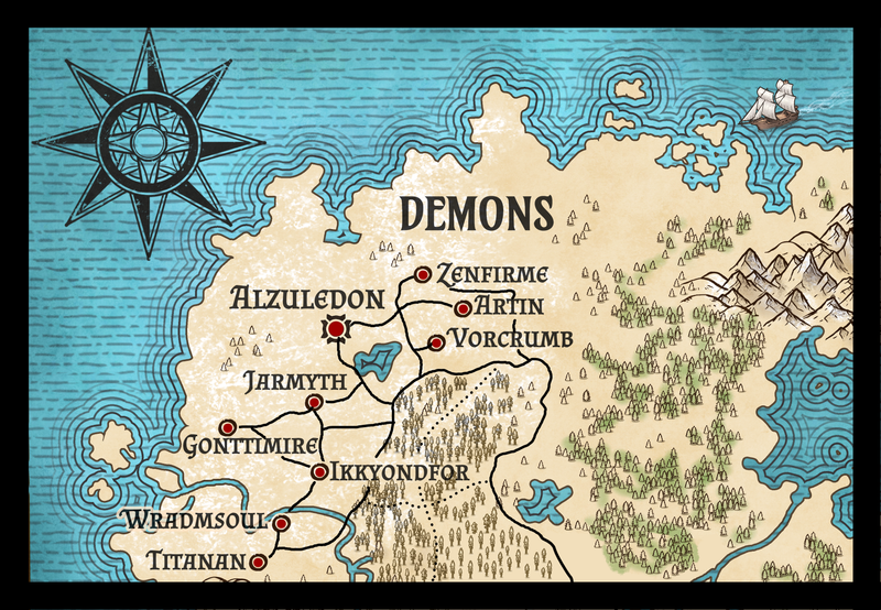 In the north the demons dwell. Their kingdom is built to survive the brutal cold that plagues their land. Just like the humans, the demons also have nine cities. However, their cities are smaller and not nearly as packed as the humans once were. While they border the Yoxtoll Forest, they aren't close to any other cities, with the closest being Ugondt. They trade somewhat with the other species, but only what they need to, preferring to stay to themselves and grow in strength. The most brutal city in the kingdom is Alzuledon, but it still pales in comparison to Piltin.