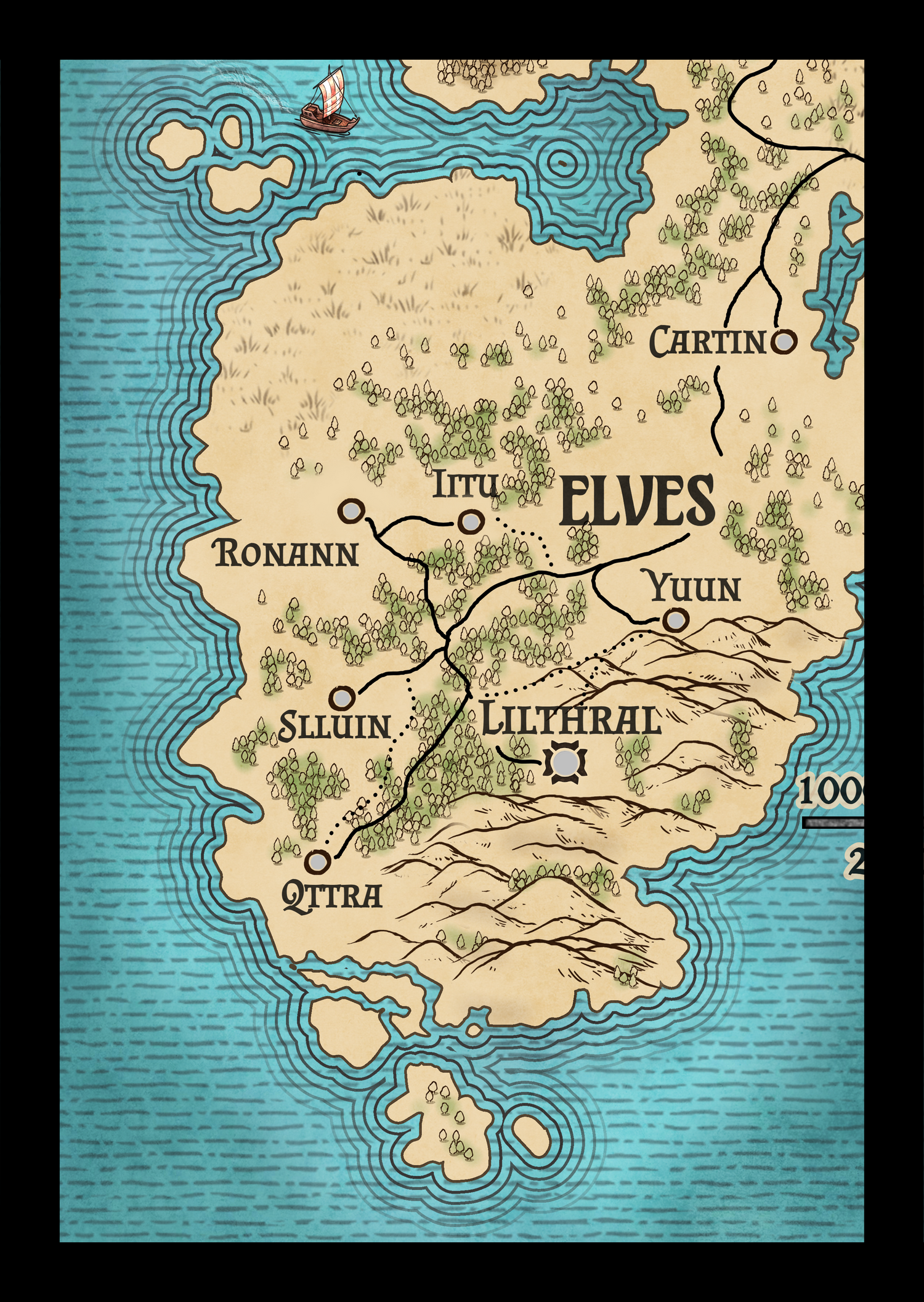 The elven city, Lilthral, is their greatest work. The city has three different levels: the base, where the commonfolk live, along with all the businesses. The second floor is the high district, the military post, ward, and the wealthy residency there. The third floor is just for the palace, where the queen, her daughter, her right hand, and servants live. There are also many guards who live in the palace, and many elves go in and out of the building.
