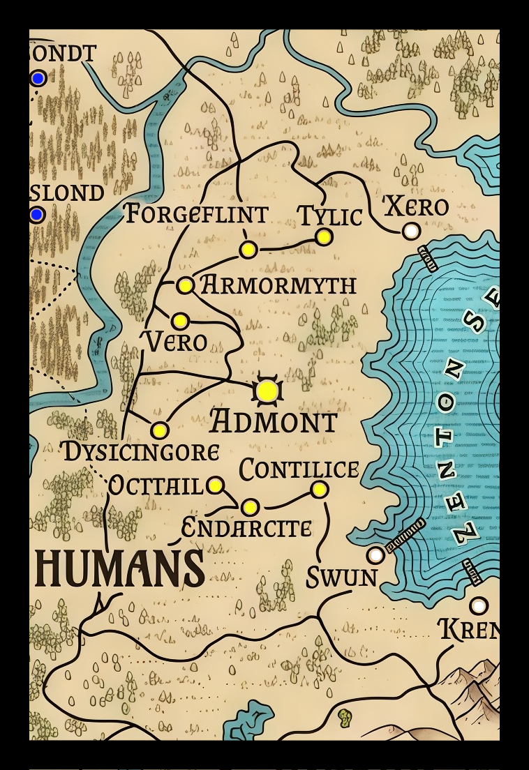 This is the area where the humans once ruled over. They possessed nine cities in total, with the capital being their magnum opus. The kingdom resided almost entirely in the grasslands and was strategically built in the center of Affer. If it wasn't for the Great War, they would have expanded their kingdom even further. Since Admont was the capital, most of the kingdom's wealth resided there, but each city held one thousand to five thousand pounds of gold at all times.
