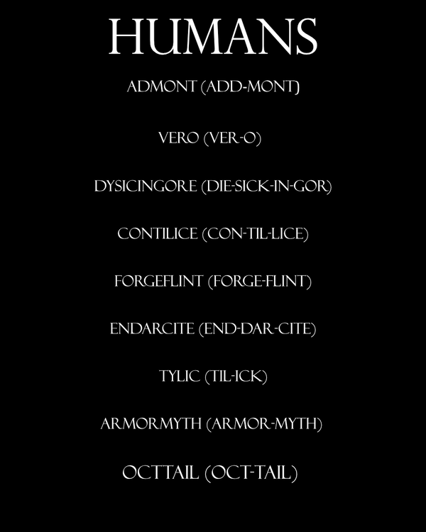 Affer is inhabited by six different species: humans, elves, hybrids, the dammed, demons, and angels. The stunning fantasy planet is home to the Yoxtoll Forest, where the trees tower above you by hundreds of feet. A brutal Tundra lies to the North-West, where the demons live. An endless sea of mountains lay to the East of them. Crossing the Grasslands of the once mighty human kingdom, the Arrgon Desert sits, where the bloodthirsty hybrids dwell. To the West are the elves in the mist of the forest. Lastly, the angel's capital city, Piltin, is the sole city on Zenton island. The grand, imposing city takes up a large part of the island and rivals the human capital, Admont, in its prime.
